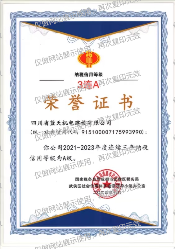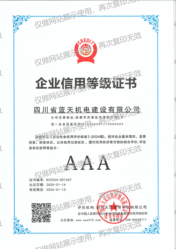 蓝天机电企业信用等级3A认证证书2025